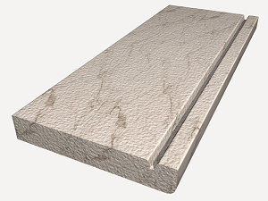 Batiente de mármol Blanco Macael, en piezas de hasta 1100 mm de longitud, hasta 200 mm de anchura y 20 mm de espesor, con goterón, cara y canto recto pulido y grava adherida a la superficie en su cara inferior. |
