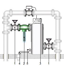 Descalcificador compacto con mando por tiempo de tres ciclos, caudal de 0,3 m³/h, con llaves de paso de compuerta.