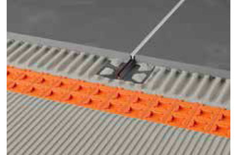 Perfil en T para juntas de partición en pisos de cerámica, de PVC, Schlüter-DILEX-FCS 90 "SCHLÜTER-SYSTEMS", de 9 mm de altura y 3,5 mm de anchura, con alas con perforaciones trapezoidales para su fijación y recubierto de CPE, con junta de absorción de movimientos de silicona para perfil, Schlüter-DILEX-FIS 300 BW "SCHLÜTER-SYSTEMS", de 3,5 mm de anchura, color blanco RAL 9010 acabado brillante.
