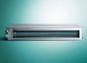 Equipo de aire acondicionado, sistema aire-aire split 1x1, modelo climaVAIR plus VAI 1 050 DN "VAILLANT", para gas R-32, alimentación monofásica (230V/50Hz), potencia frigorífica nominal 5 kW, potencia frigorífica mínima/máxima 1,6/5,5 kW, consumo eléctrico en refrigeración 1,55 kW, SEER 6,1 (clase A++), potencia calorífica nominal 5,5 kW, potencia calorífica mínima/máxima 1,5/6 kW, consumo eléctrico en calefacción 1,45 kW, SCOP 4 (clase A+), formado por una unidad interior de techo con distribución por ducto rectangular de baja silueta VAI 1-050 DNI, presión sonora mínima/máxima 36/43 dBA, dimensiones 200x1000x450 mm, peso 26 kg, mando a distancia, y una unidad exterior VAI 1-050 KDNO, con compresor tipo Inverter DC, presión disponible ajustable, presión sonora 53 dBA, dimensiones 596x818x302 mm, peso 39 kg, diámetro de conexión de la tubería de gas 1/2", diámetro de conexión de la tubería de líquido 1/4", con amortiguadores de muelles, soportes y fijaciones de las unidades interior y exterior, bomba para elevación de condensados, conexión frigorífica entre unidades, conexión eléctrica entre unidades, sujeción y protección mecánica de los tendidos de líneas con ocultación bajo canaleta registrable en zonas vistas. Incluso elementos antivibratorios y soportes de pared para apoyo de la unidad exterior y elementos para suspensión del techo para la unidad interior.